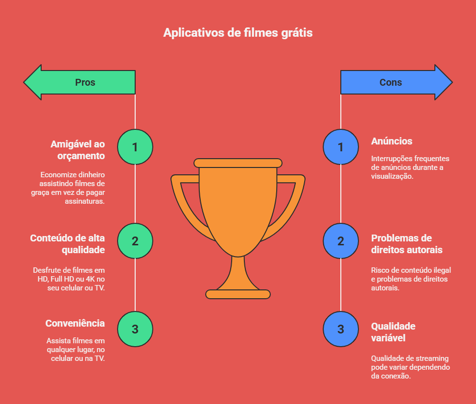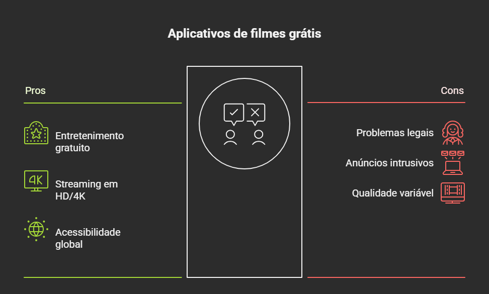 | Reputação do App | Apps populares como FreeCine e Cinema App são seguros. | Apps não verificados podem oferecer conteúdo pirata. |